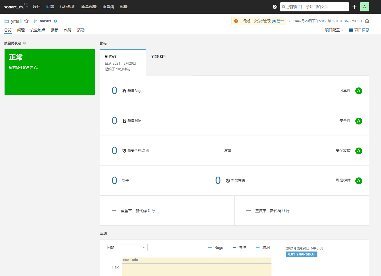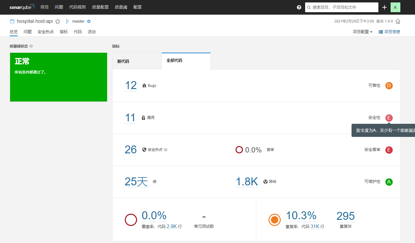 查看SonarQube,新代码代表更新的代码漏洞是否新增,全部代码为老代码
