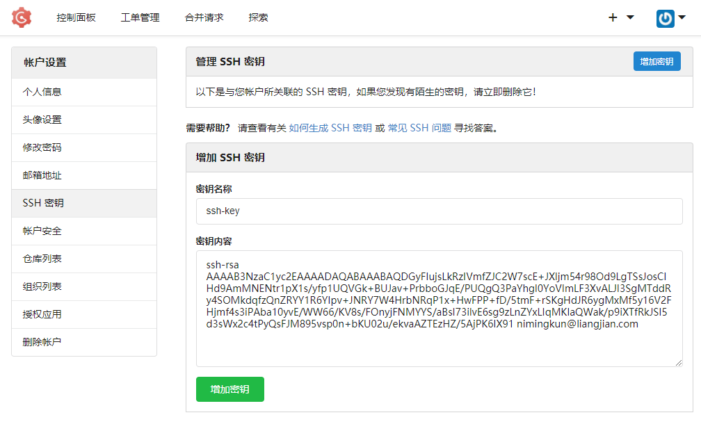 [root@public code]# ssh-keygen -t rsa -C "nimingkun@liangjian.com" Generating public/private rsa key pair. Enter file in which to save the key (/root/.ssh/id_rsa): Enter passphrase (empty for no passphrase): Enter same passphrase again: Your identification has been saved in /root/.ssh/id_rsa. Your public key has been saved in /root/.ssh/id_rsa.pub. The key fingerprint is: SHA256:G706PSkd8DxM7JS+wDzdrmZbFiZWuCYq/cpZXmr1g1k nimingkun@liangjian.com The key's randomart image is: +---[RSA 2048]----+ | | | . | | .... | | ..=o | | oS@*.o | | . .=*@+E. | | . o o*o@o | | o =++@o+ | | +o==o+ . | +----[SHA256]-----+ [root@public code]# ll ~/.ssh/ 总用量 12 -rw------- 1 root root 1679 10月 13 15:23 id_rsa -rw-r--r-- 1 root root 405 10月 13 15:23 id_rsa.pub -rw-r--r--. 1 root root 175 9月 21 16:32 known_hosts