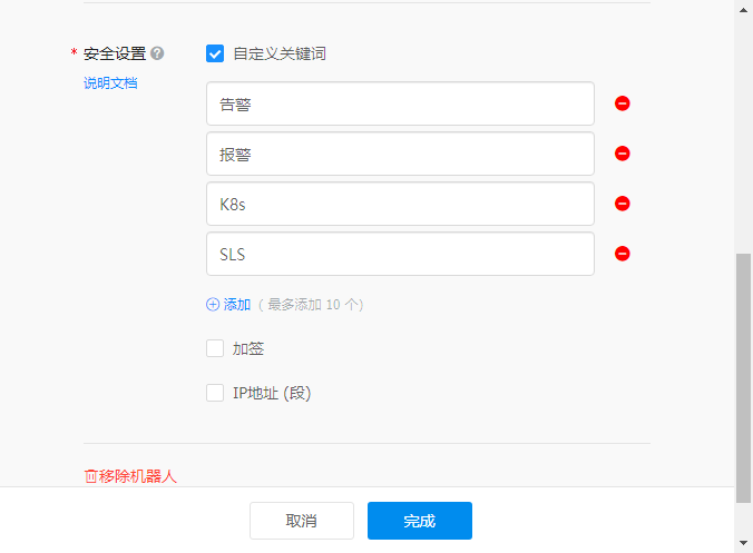 把Webhook复制下来,粘贴到报警联系人处,配置钉钉机器人接受的消息,包含有自定义的关键词该钉钉机器人才能告警