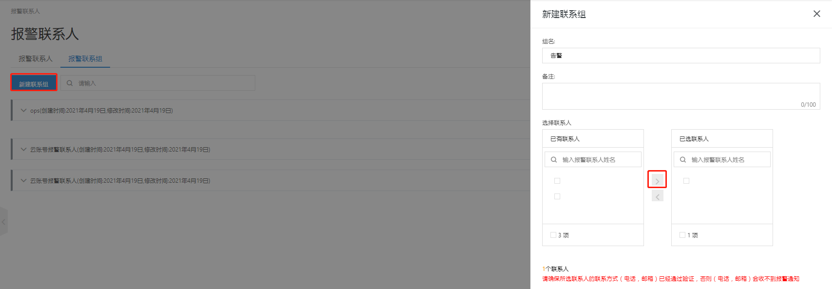 添加新建的报警联系人到报警联系组里