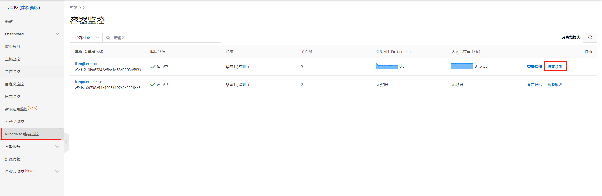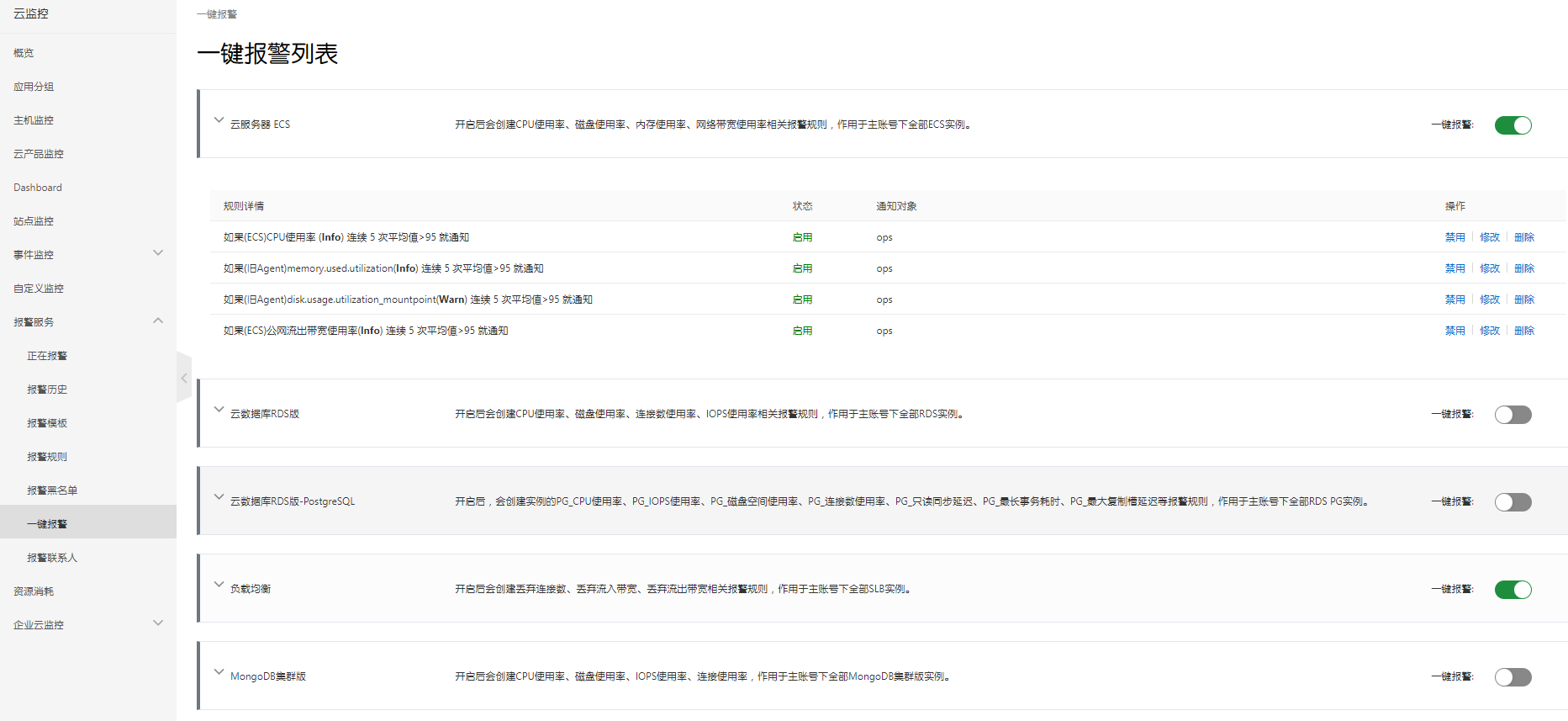 开启已使用服务的一键告警