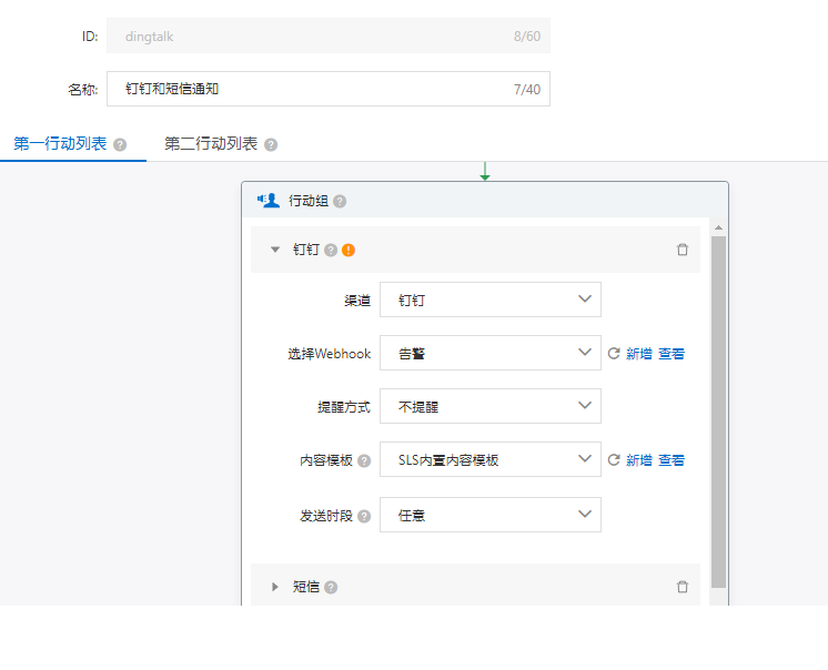 配置钉钉和短信告警的通知内容和通知人员,可自定义内容模板配置通知的消息样式