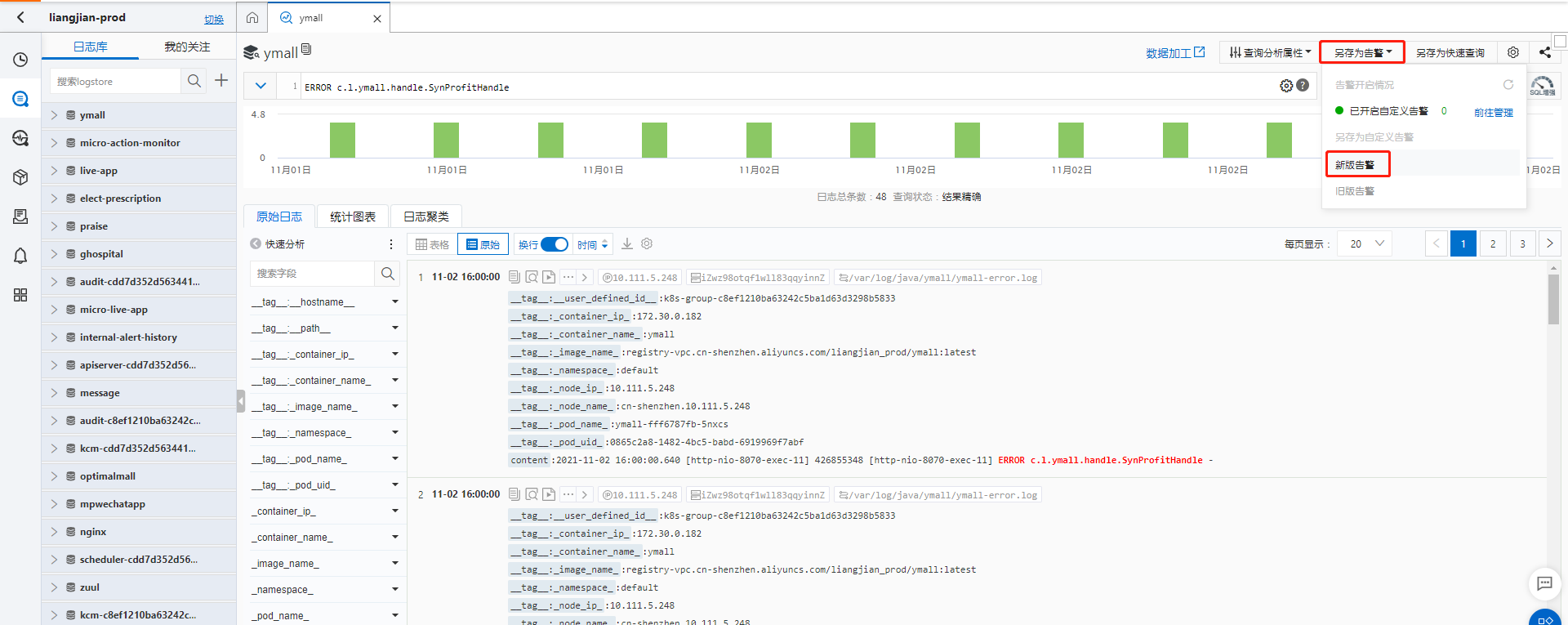 查询服务报错的日志通过日志监控进行告警