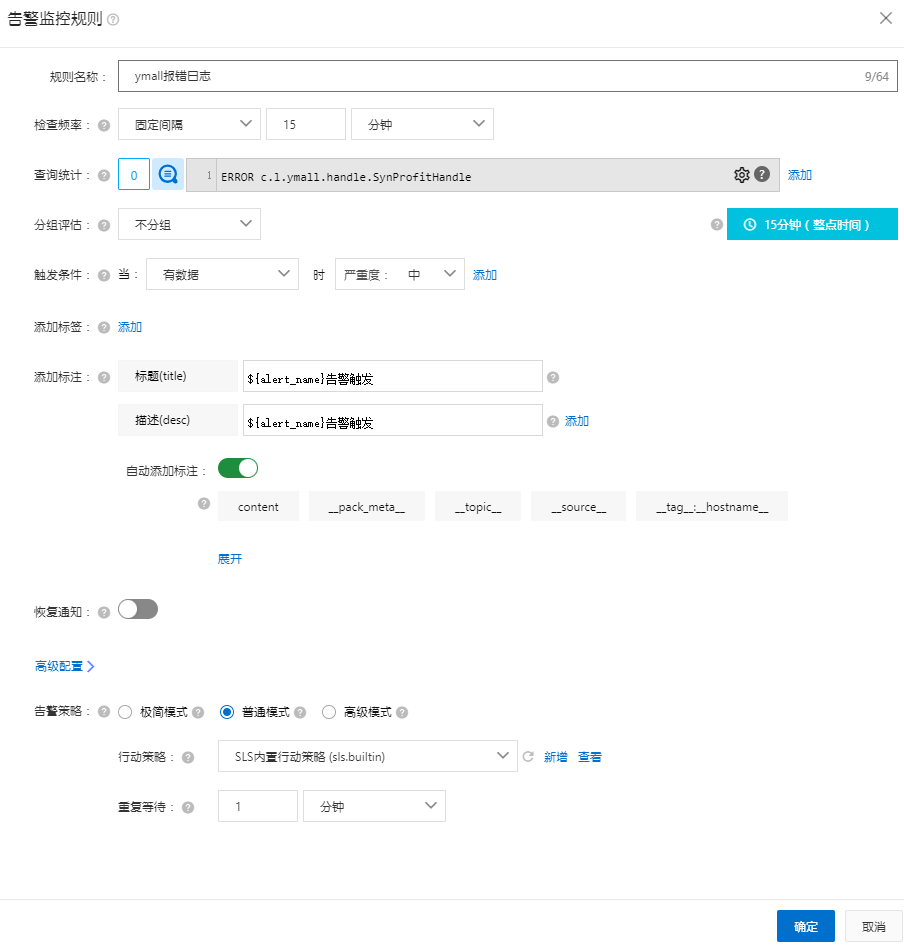 配置每15分钟监控日志,如果日志中有该数据会进行告警