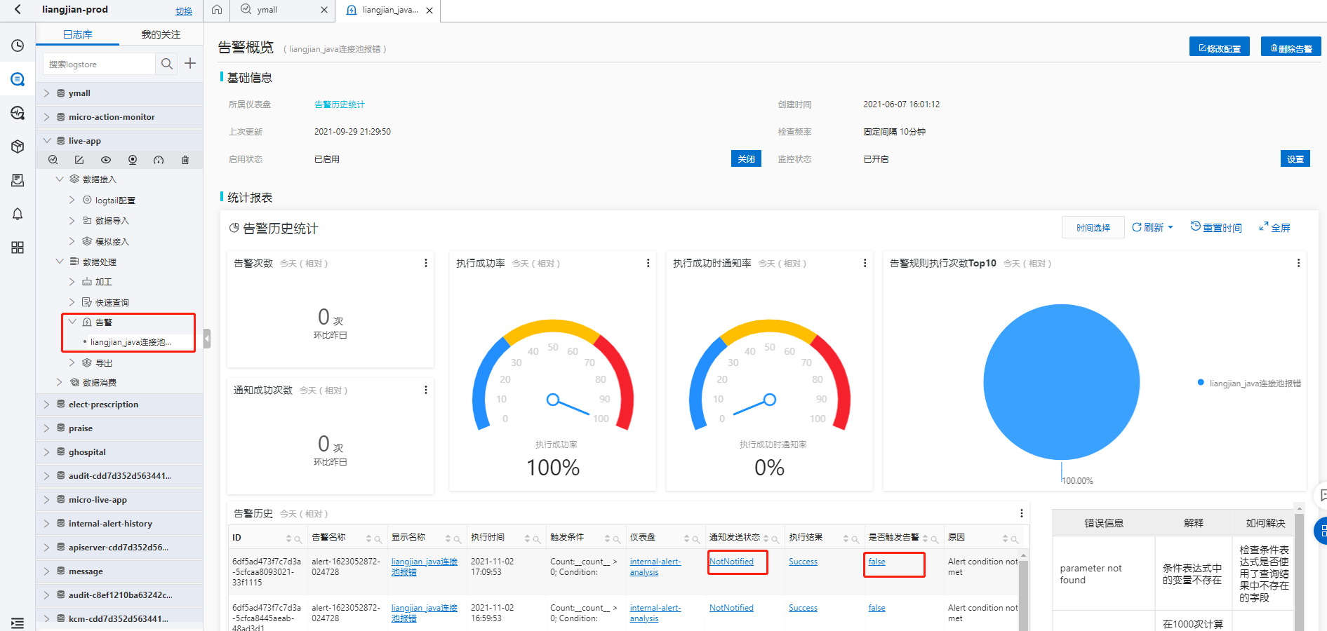 可在告警看到创建的告警,该告警的执行状态,是否触发通知