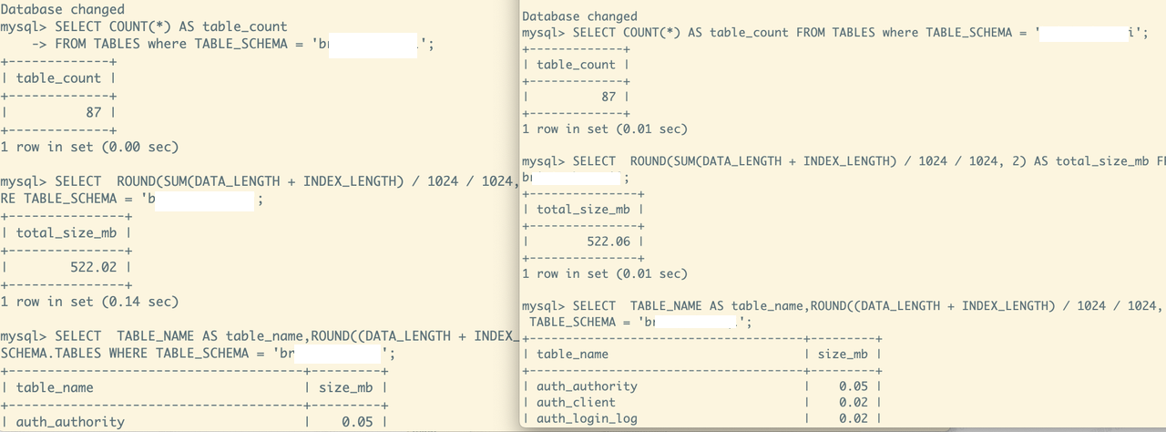 对比原数据库的库数量,表数量,库大小,表大小,均是正常。